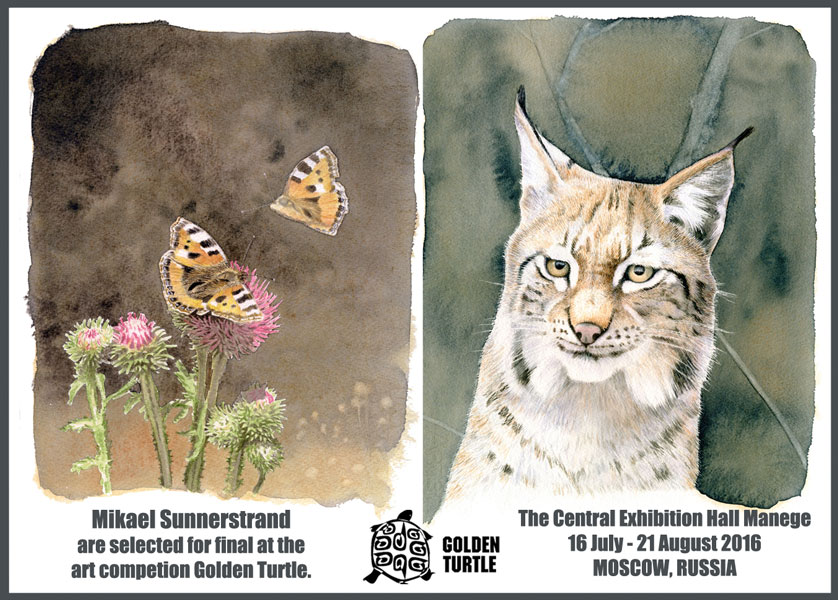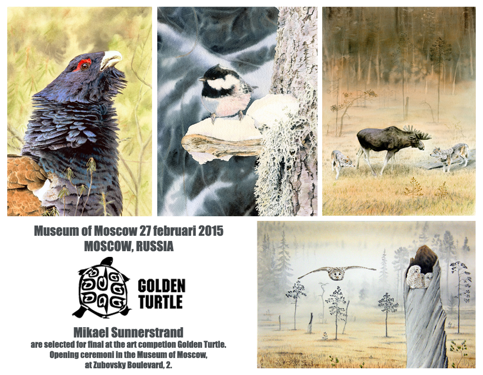 Utställningar 2015 27 februari är det öppningsceremoni för Golden Turtle art competition i Moskva. På Museum of Moscow, Zubovsky Boulevard, 2, Ryssland! (En internationell konsttävling för oss som målar vilda djur.) Jag har fått med 4 akvareller till final och är tydligen den enda svensken som juryn valt ut. Så vill man få det att låta stort så representerar jag Sverige! Om jag förstått allting rätt, så pågår utställningen fram till den 5 april.